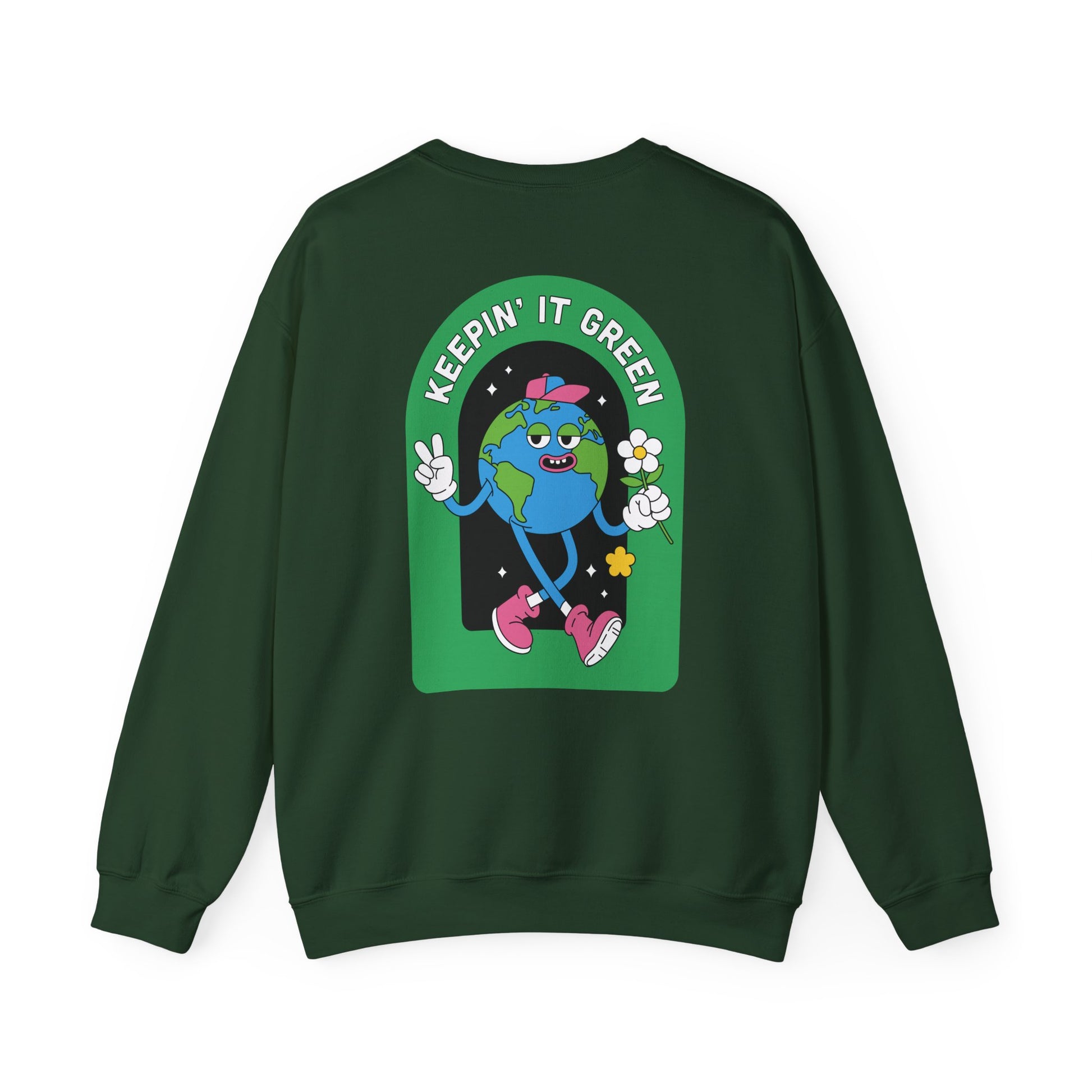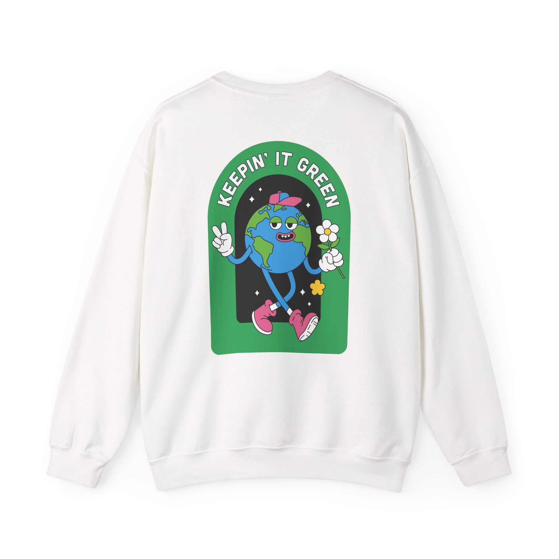 A soft, cozy sweatshirt that wears like a friendly reminder to keep things green. The midweight 50/50 cotton-poly blend settles comfortably across your shoulders, while the ribbed crewneck and double-needle stitching stand up to repeated wear and washes. Front-chest embroidery shows a small, tidy eco badge; the back blooms into a playful illustrated Earth character in sneakers with the phrase “Keepin’ It Green.” It’s the sort of sweatshirt you reach for on crisp mornings, at community cleanups, or when you want to make a low-key sustainability statement without saying a word. Lightweight enough for layering, durable enough for weekday routines, and finished with tear-away labels for itch-free comfort.